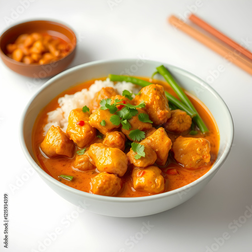 A Curry with chicken and onions Asian cuisine isolated on the white background