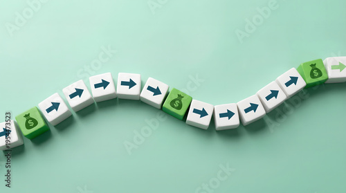 A curved line of white and green blocks with arrows and dollar signs on a light green background