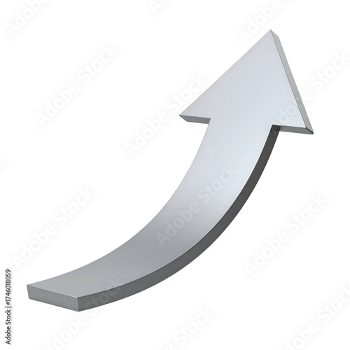 A curved, three-dimensional silver arrow pointing upwards against a black background