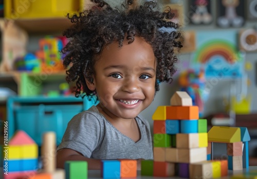 a cute african american girl with curly hair playing with blocks