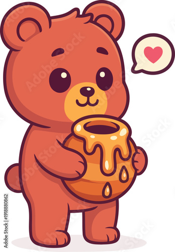 A cute, brown bear lovingly holds a dripping honey pot, conveying sweetness and warmth, ideal for children's content, nature themes, and animal illustrations.