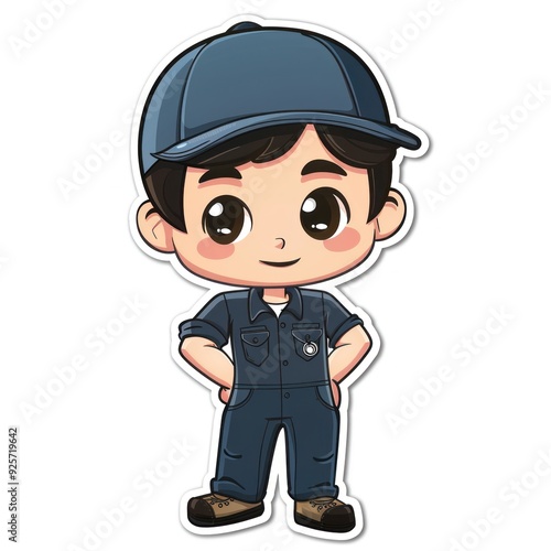 character, cartoon, boy, uniform, cap, smile, cute, playful, design, illustration, fun, happy, men at work, outfit, casual attire, standing, pose, friendly, youth, style, art, graphic, animation, creativity, children, profession, blue, brown, shoe, hand, eye, expression, personality, cheerful, vibrant, modern, simple, adorable, engaging, imaginative, unique, identity