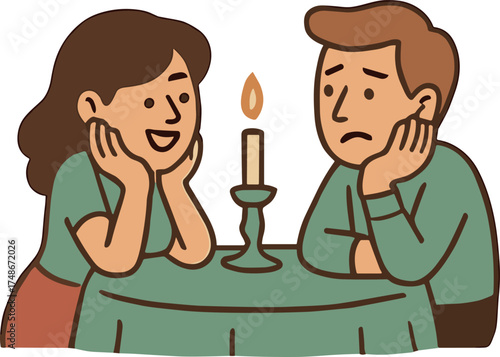 A cute cartoon illustration of a couple sitting at a table with a candle, showing a woman happily talking while the man looks bored, drawn in warm tones with a flat vector style.