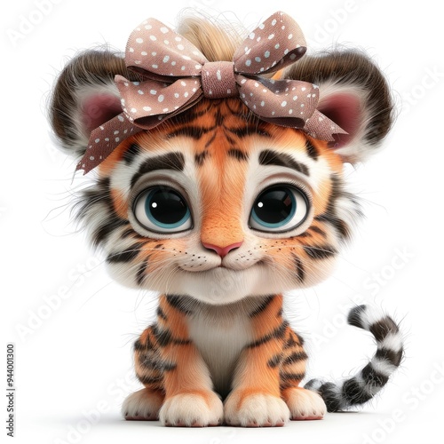 A cute cartoon tiger with a bow, depicted with a happy expression, is perfect for a children's book or a fun and friendly character design.