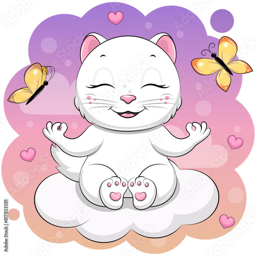 A cute cartoon white cat is meditating on a cloud. Vector illustration of an animal with butterflies in the sky.