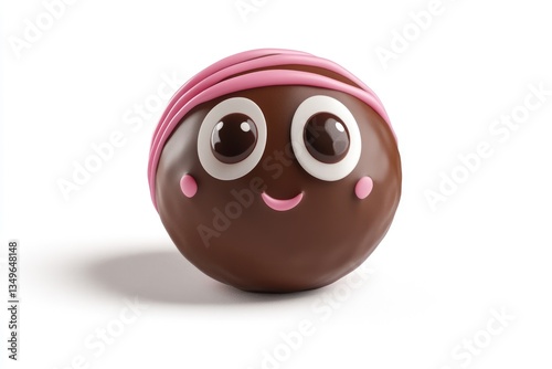 A cute chocolate sphere with pink icing, big eyes, and a happy smile.
