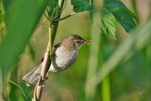 A cute Common reed warbler sits on a reed stalk and has an insect in its beak. Acrocephalus scirpaceus. A reed warbler in the nature habitat.