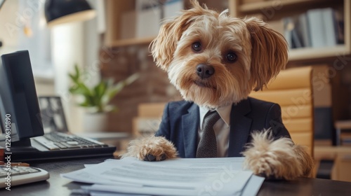 dog, office, suit, professional, cute, responsibility, intelligent, organisation, paperwork, attire, humor, relaxed, unique, playful, teamwork, joyful, desktop, friendly, furry, canino, companion, career, confident, pet, personality, expression, amusing, comfort, image, companionship, funny, scene, whimsical, adorable, managing, loyalty, imaginative, work, charming, role, dedicated, business, character, lifestyle, concept, animal, design, creative, quirky
