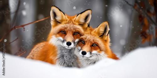 A Cute foxes on the snow during winter season. digital art