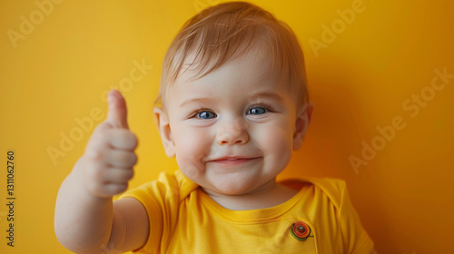 A cute happy smiling toddler baby in a yellow t-shirt shows a thumbs up gesture on a colored background.