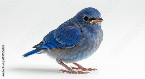 A cute little bluebird standing on one leg, its delicate feathers detailed against a white background.