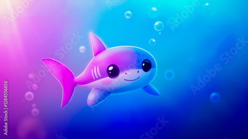 cute, little, pink, shark, swimming, ocean, bubble, cartoon, whale, underwater, sea, marin, aquatic, colourful, digital, art, illustration, character, friendly, playful, blue, big, smile, face, 2, large, round, eye, small, nose, body, fluffy, fin, widener, out, background, gradient, purple, floating, around, mood, cheerful