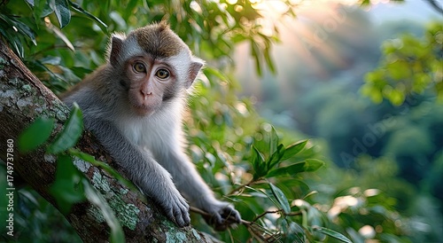 a cute monkey sitting on a tree branch in the jungle, with morning light rays shining through the trees