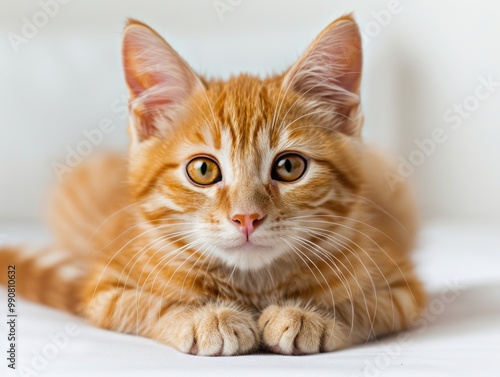 A cute orange tabby kitten lying down, with bright yellow eyes, showcasing a playful and curious demeanor.