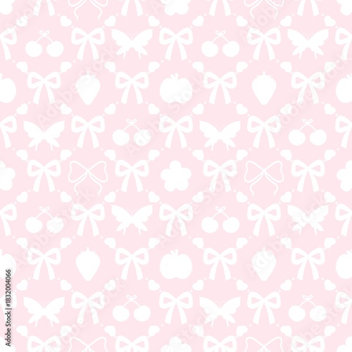 A cute pastel coquette seamless pattern featuring soft ribbons, bows, hearts, and delicate decorative elements. Perfect for gift wrapping, scrapbook paper, stationery design, textile prints, and girly