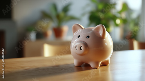 A cute pink piggy bank sits on a wooden table, ready to save money for the future.