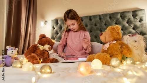 A cute small girl sitting alone cross-legged on a big bed making selfies with her tablet having her teddybears around her