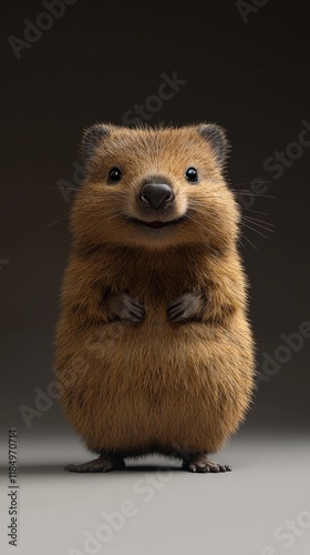 A cute, smiling quokka stands upright against a dark background, showcasing its fluffy fur and friendly demeanor.