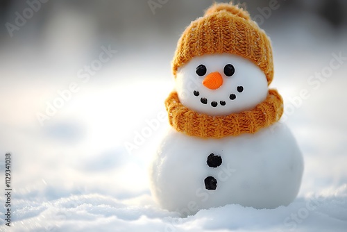 A cute snowman wearing a knitted orange hat and scarf stands in the fresh snow, bringing winter joy.