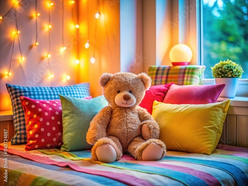 A cute teddy bear's playful presence defines this cozy, colorful kids' bedroom filled with soft toys and pillows.