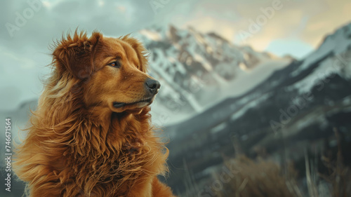 A cute Tibetan Mastiff hiking in the mountains.
