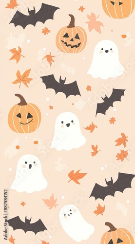 A cute wallpaper featuring small pumpkins, bats, and ghosts on a light brown...