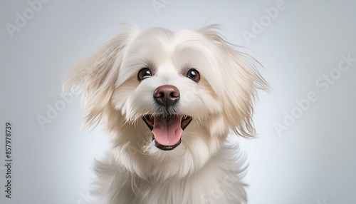 A cute white Maltese dog smiles happily on a light background. Ideal for advertising and concepts related to pets.