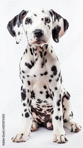 dalmatian, dog, canino, pet, animal, white, black, spot, sitting, looking, background, portrait, studio, photo, breed, purebred, furry, cute, adorable, friendly, loyal, playful, happy, cheerful, curious, attentive, observant, alert, ear, tail, paw, fur, coat, eye, nose, mouth
