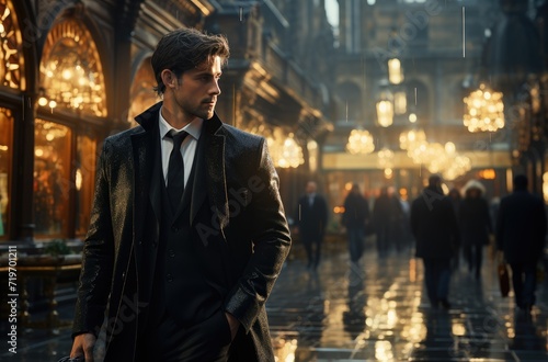 clothing, person, coat, building, jacket, man, human face, gentleman, suit, city, street, standing, wet, rainy, soaked, professional, business, urban, fashion, modern, elegant, reflective, serious, confident, stylish, sophisticated, raincoat, posh, dapper, poised, composed, smart, city landscape, stoic, wet hair, architectural, charme, cosmopolitan, street light, timeless, atmospheric, bustling
