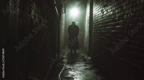 A dark alleyway is illuminated by a fallen angels halo piercing the shadows as they move with a smooth and calculated grace.