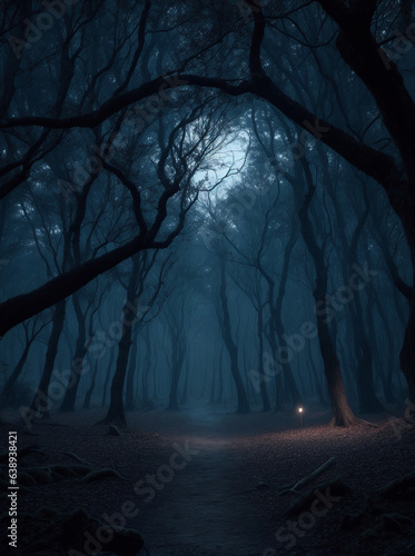 dark, twisted, forest, illuminated, full moon, sorcerer, enchantment, eerie, mystical, mysterious, shadow, haunting, ominous, supernatural, black magic, enchanting, magical, ai, generative, tree, tree, fog, mist, light, nature, night, wood, misty, wood, foggy, road, fantasy