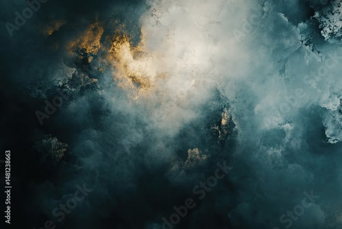 A dark, atmospheric background featuring dramatic, textured clouds and subtle rays of light breaking through, evoking feelings of mystery and introspection. The muted tones and rich contrasts moody