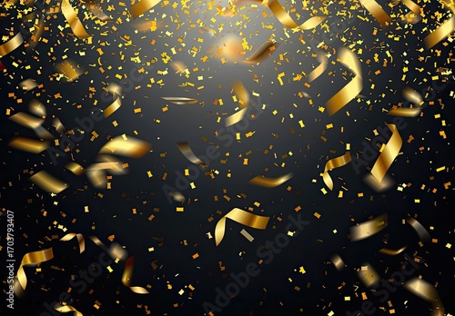 gold, confetti, ribbon, celebration, festive, party, background, dark, black, shiny, glistering, sparkle, falling, dynamic, joyful, happy, luxury, elegant, event, new, year, holiday, anniversary, success, achievement, bright, light, illumination, texture, design, abstract, pattern, graphic, vector, illustration, scene, vibrant, shimmer, celebratory, glamour, magnificent, joyous, merry, splendid, dazzling, radiant