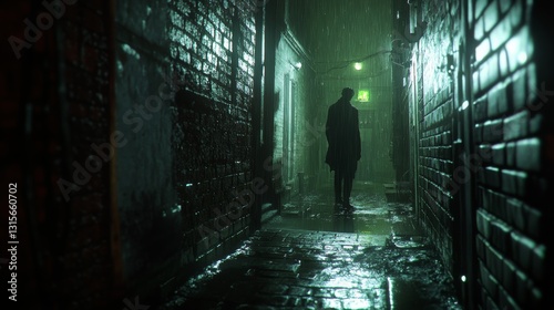 A dark, blurry silhouette of a person standing at the far end of a narrow alleyway, partially hidden in the shadows