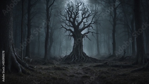 A dark forest with a few trees in the fog and a bird perched on a tree.