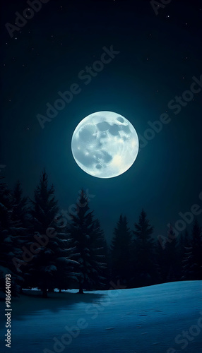 A dark minimalistic scene featuring a moonlit snowy landscape, creating a serene and tranquil atmosphere, with soft shadows and a tranquil ambiance