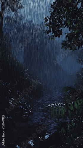 jungle, rain, night, path, vegetation, nature, tree, leaf, shadow, mist, water, calmness, wilderness, landscape, foliage, atmosphere, serenity, environment, beauty, adventure, exploration, darkness, calm, scenery, depth, moisture, ecosystem, silence, growth, flora, fauna, vibrant, greenery, wet, damp, reflections, solitude, remote, peaceful, natural, wild, scenic, exotic, lush, mysterious, enchanting