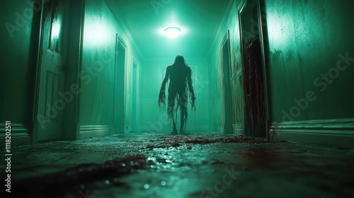 A dark silhouette of a menacing figure ominously lurks at the end of a dimly lit hallway, casting an aura of fear and suspense, against the eerie green backdrop.