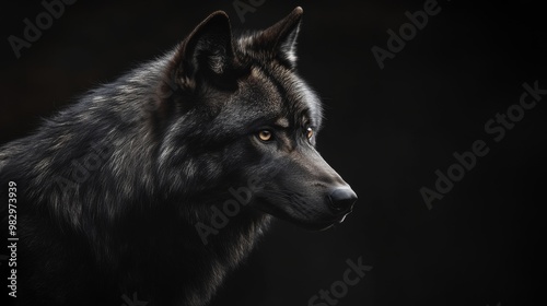 A dark wolf against a completely black backdrop.