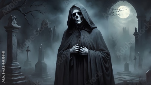 A dark-cloaked, hooded woman, resembling a vampire, stands amidst a graveyard on Halloween night