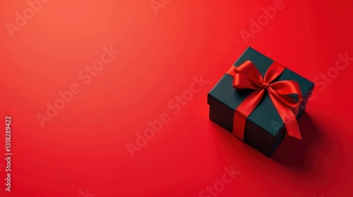 A dark-colored gift box with a vibrant red ribbon bow, positioned on a rich red background, presents a sophisticated and celebratory aesthetic.