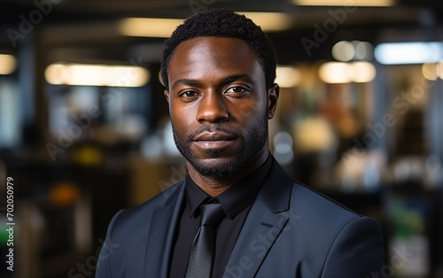 A dark-skinned 30-year-old businessman stands in the office. Successful mature boss working inside modern office building.