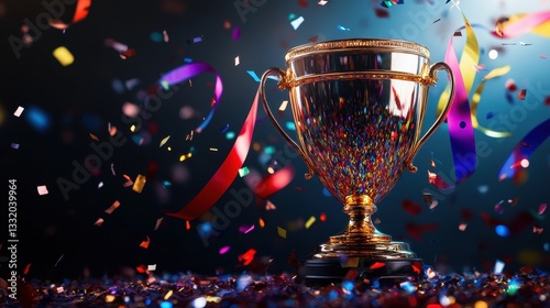 A dazzling trophy with colorful confetti, symbolizing achievement and celebration in a festive atmosphere.