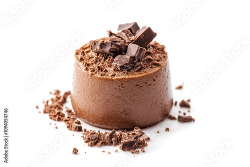 A decadent chocolate dessert topped with chocolate pieces, perfect for indulgence.