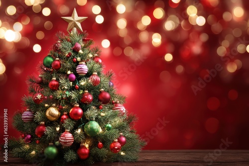 A decorated Christmas tree with colorful ornaments and lights stands against a festive red and gold bokeh background