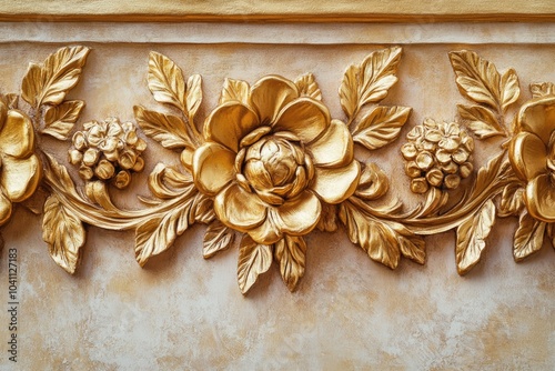 A decorative element for interior design featuring golden details, flowers, and leaves