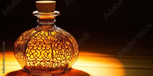 bottle, glasses, amber, decorative, intricate, design, liquid, cork, light, shadow, art, craftsmanship, texture, elegance, pattern, vintage, luxury, beverage, container, aroma, essence, style, culture, heritage, beauty, shine, warmth, glow, fluid, artistic, unique, hand-made, traditional, ornate, charme, refinement, aesthetic, artisan, classic, opulent, rich, colours, illumination, sharpened, clarity, showcase, display, ambience, sophistication