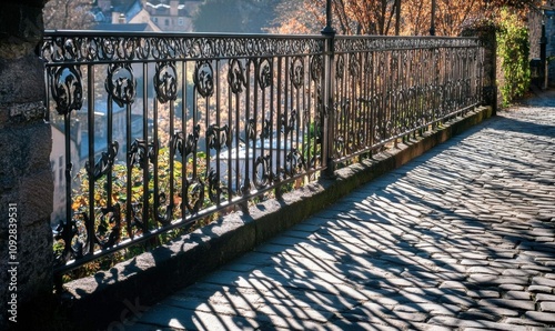 fence, shadow, cobbled, path, iron, design, sunlight, tree, autumn, architecture, railing, nature, scenery, park, landscape, texture, detail, environment, light, pattern, stone, paseo, calmness, urban, decorative, heritage, historic, beauty, perspective, view, foliage, colours, peaceful, craftsmanship, artistry, line, symmetry, scene, vintage, rustic, charme, elegance, pathway, surrounding, warmth, ambience