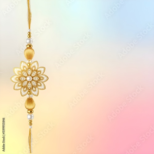A decorative Rakhi positioned vertically on the left side of the image against a soft pastel ombre background. Ideal for copy space, cards, banners, covers, templates, wallpapers, and more.