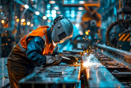 A dedicated worker in protective gear, welding steel beams with bright sparks flying